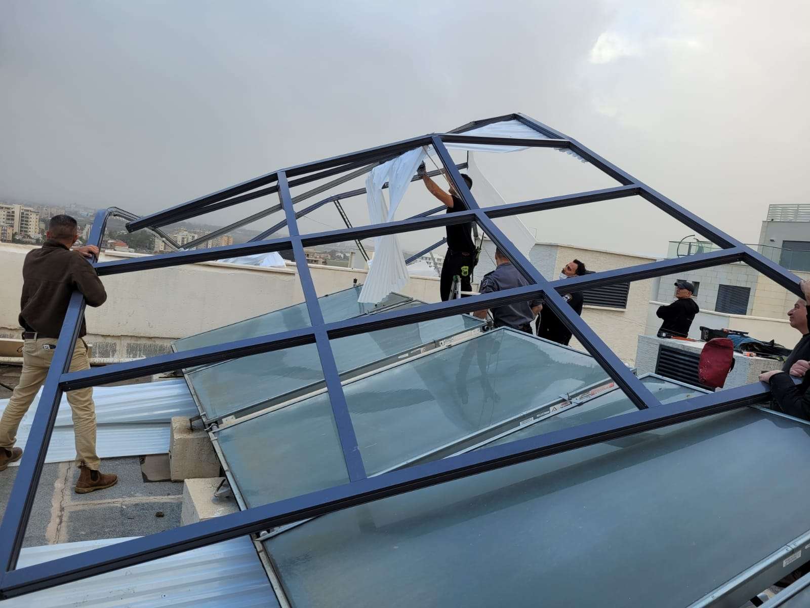 בשעות אחר הצהריים אתמול פעלו בקרית אתא שני צוותים של לוחמי אש, בפיקודו של להב קוסטה קריניצקי, במבנה בן שבע קומות, כאשר בקומה השביעית קרסה פרגולה ונתלשה ממקומה בעקבות הרוחות העזות.