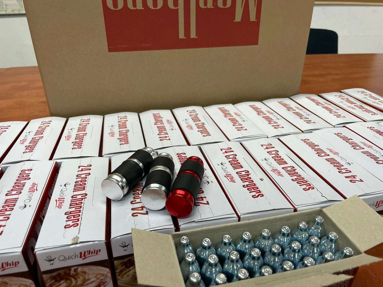 השוטרים החרימו את המיכלים של “גז הקצפות” וזימנו את בעל העסק לחקירה. צילום: דוברות המשטרה, מחוז חוף