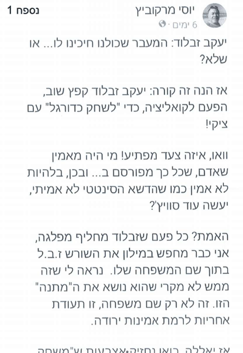 על פי התביעה, אותה הגיש עו”ד יואב סתיו החיפאי, הוצג יעקב זבלוד, כזבל אנושי. בפוסט שהעלה יוסי מרקוביץ, הוא כתב בין השאר: “האמת? כל פעם שזבלוד מחליף מפלגה, אני כבר מחפש במילון את השורש ז.ב.ל בתוך שם המשפחה שלו. נראה לי שזה ממש לא מקרי, שהוא נושא את ה”מתנה” הזו. זה לא רק שם משפחה, זו תעודת אחריות לרמת אמינות ירודה”.