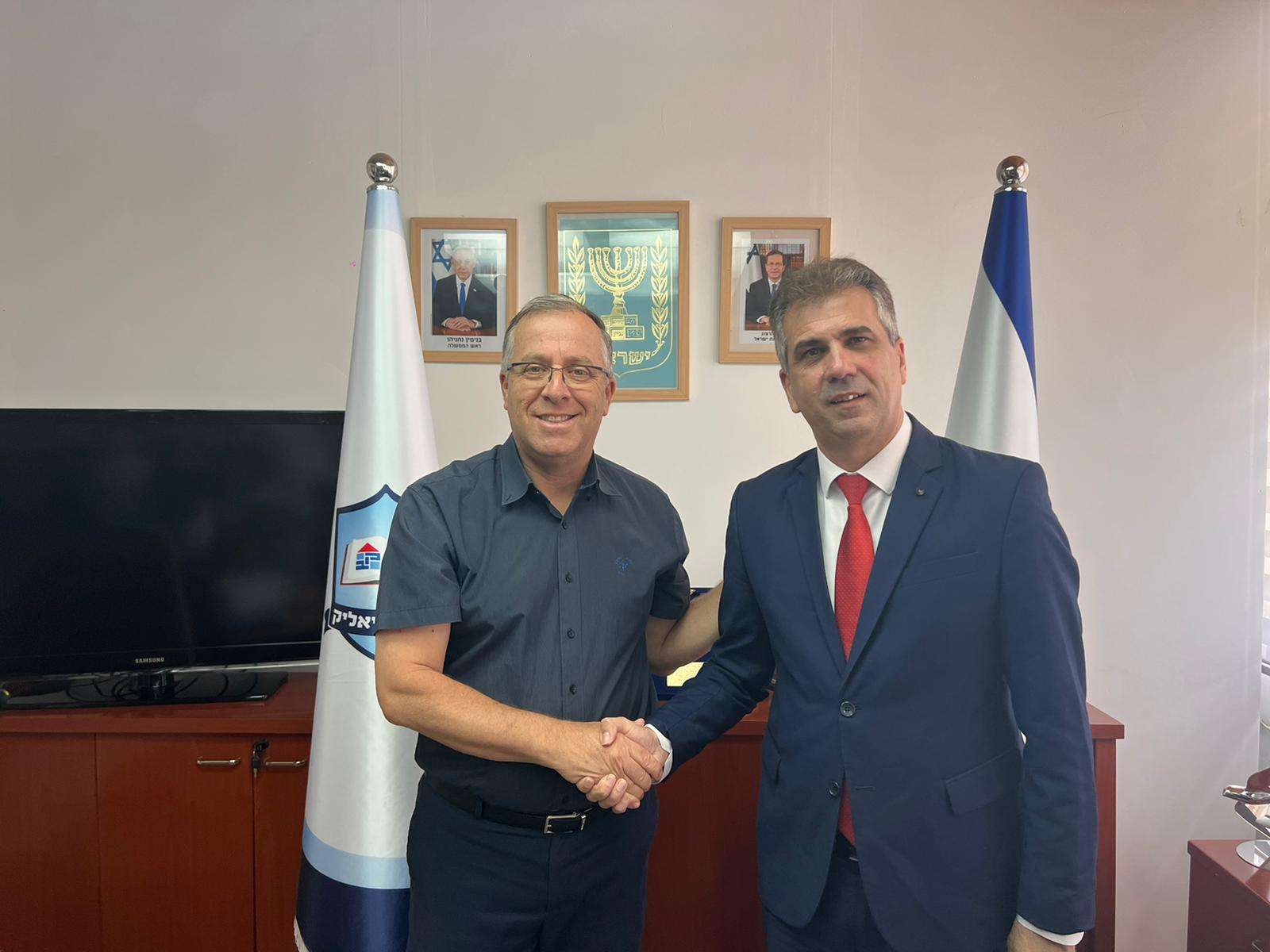 מפגש חברים. תלמידי קריית ביאליק יעסקו בדיפלומטיה ובהסברה. ראש העיר קריית ביאליק ושר החוץ. צילום: דוברות העירייה