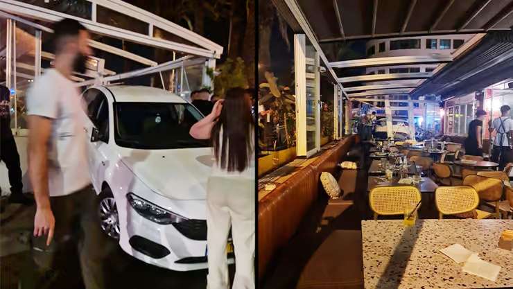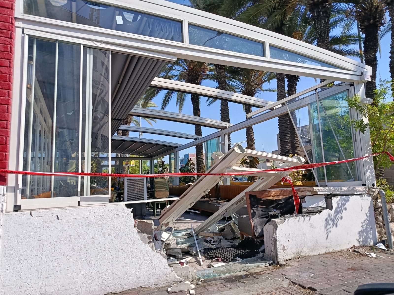 נהג הרכב איבד שליטה, תוך שנכנס למרפסת המעשנים הסגורה בבית הקפה וגרם לנזק רב. צילום: חן איטח, רשתות חברתיות, לפי ס' 27א'.