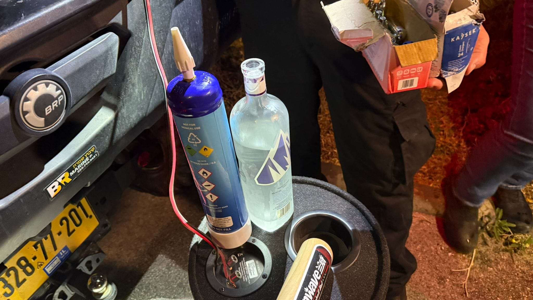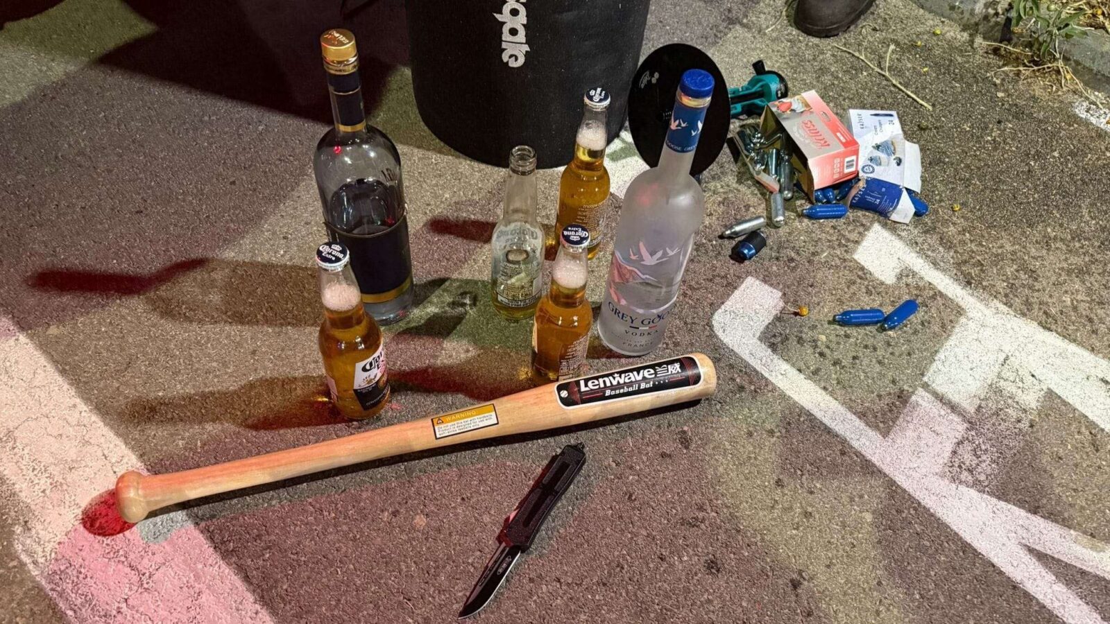 ציוד לחימה שנתפס ובהם אלה, סכין, אלכוהול ובלוני גז שהוחרמו. צילום: ראובן כהן, דוברות העירייה.