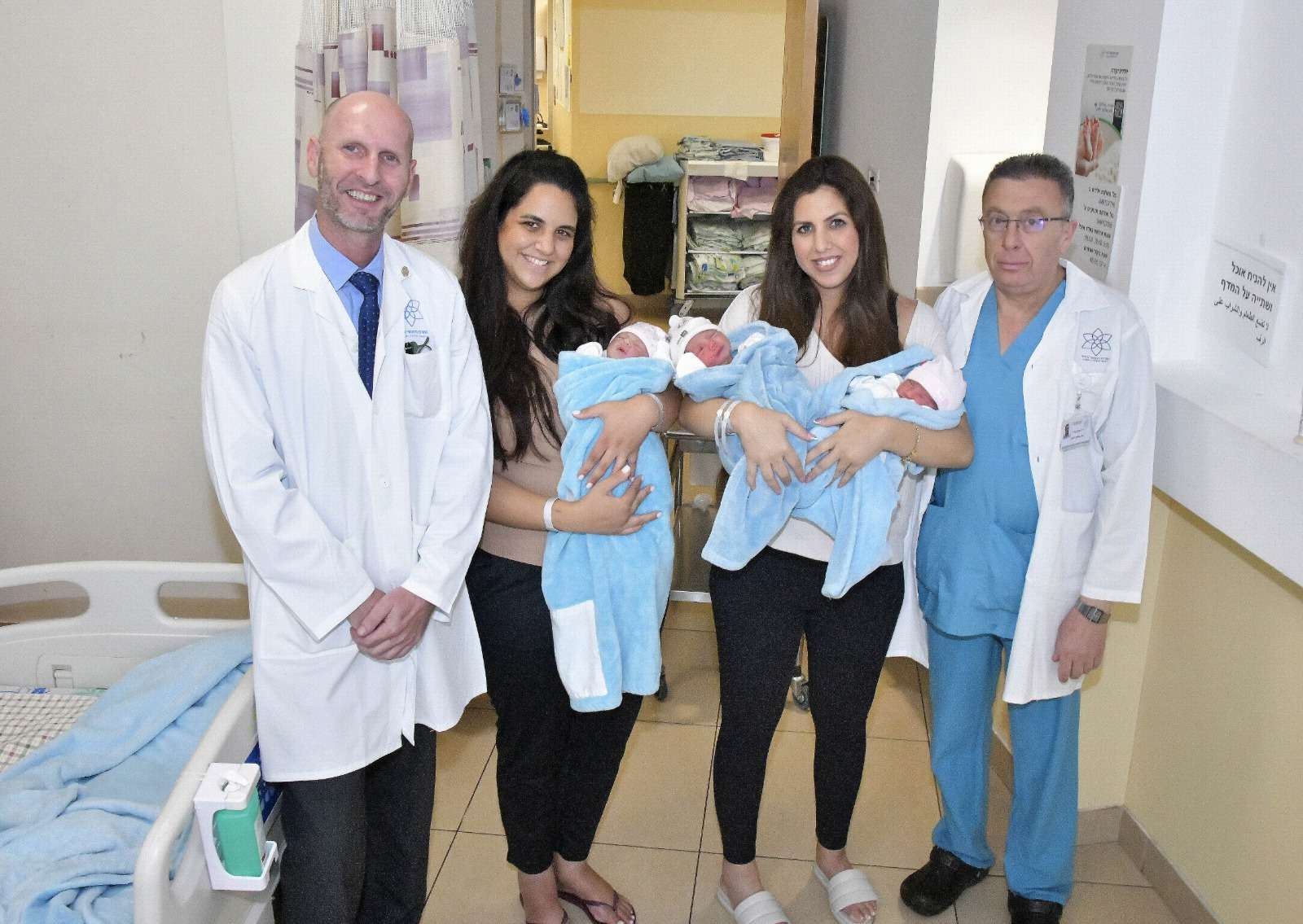 מנהל אגף נשים ויולדות, פרופ’ ליאור לבנשטיין, ומנהל מחלקת יולדות וחדר לידה, ד”ר נדיר גאנם: “שמחנו להיות חלק מהשמחה המשולשת של עינב וליעם, שילדו שלושה תינוקות תוך ארבע שעות. זה צירוף מקרים נדיר ומיוחד. צוות האגף תמיד נכון להעניק שירות איכותי ומקצועי ברמה הגבוהה ביותר”.
