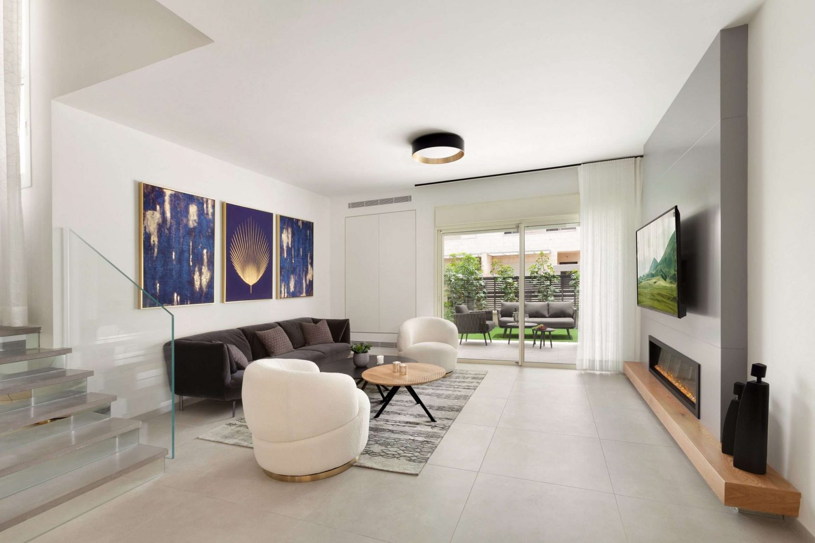 מעצבת הפנים דפנה עברי, שעיצבה את צמוד הקרקע, מציינת: “בחרתי לעצב את צמוד הקרקע בסיגנון אקלקטי המשלב מודרני ווינטג’. מדרגות בטון ורייזרים מחופים במראה ומעקה זכוכית לתחושת מדרגות מרחפות בצורה מינימליסטית ועדינה. גוף תאורה דומיננטי בשילוב עציץ מעץ מעל האי מכניס חמימות. גוף תאורה תלוי בשרשראות ברזל בחלל המדרגות מעל פינת האוכל, המקנה מראה תעשייתי מיושן כמו במבני השימור דוגמת מפעל אירופאי מהמאה הקודמת. את כורסאות הסלון בבסיס זהב עגול בחרתי כדי להביע זרימה עגולה ואנרגטית הסובבת את מי שיושב עליה,  כשמעליהן גוף תאורה עגול צמוד תקרה. מראה ארוכה מקיר פינת האוכל משווה מראה של מרחב גדול ואסתטיקה. מטבח מינימליסטי לבן וארונות עליונים עשויים מראה כהה, נקי ונוח באופן מיטבי לעבודה ולהשתלבות עם המראה הכללי של הבית. גם את חדרי הילדים עיצבתי בסגנון רטרו מודרני. חדרי הרחצה מרוצפים ומחופים באריחי עץ בדוגמת פיש בון במרקם אלכסוני משתלב וברזי וינטג שחורים. בסך הכל עיצוב הבית משלב אקלקטיות באופן קלאסי, יוקרה מודרנית ופנג-שוואי עתיק יומין גם יחד.