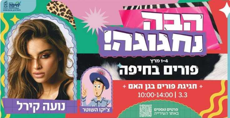 שלל אירועים: חגיגות הפורים בחיפה, יתפרסו השנה על פני מוקדים מרכזיים, במרכז הכרמל, הדר והעיר התחתית, ויציעו חוויות משפחתיות, מופעי חוצות ופעילויות יצירה לציבור הרחב. במרכז האירועים תעמוד חגיגת פורים בגן האם, שבמרכז הכרמל, שתכלול חגיגת תחפושות, מופעים לילדים ולמשפחות, והופעה של נועה קירל. האירוע יתקיים ביום שלישי, 3.3, בין השעות 10:00–14:00 והכניסה אליו חופשית, בהרשמה מראש בקישור הבא: