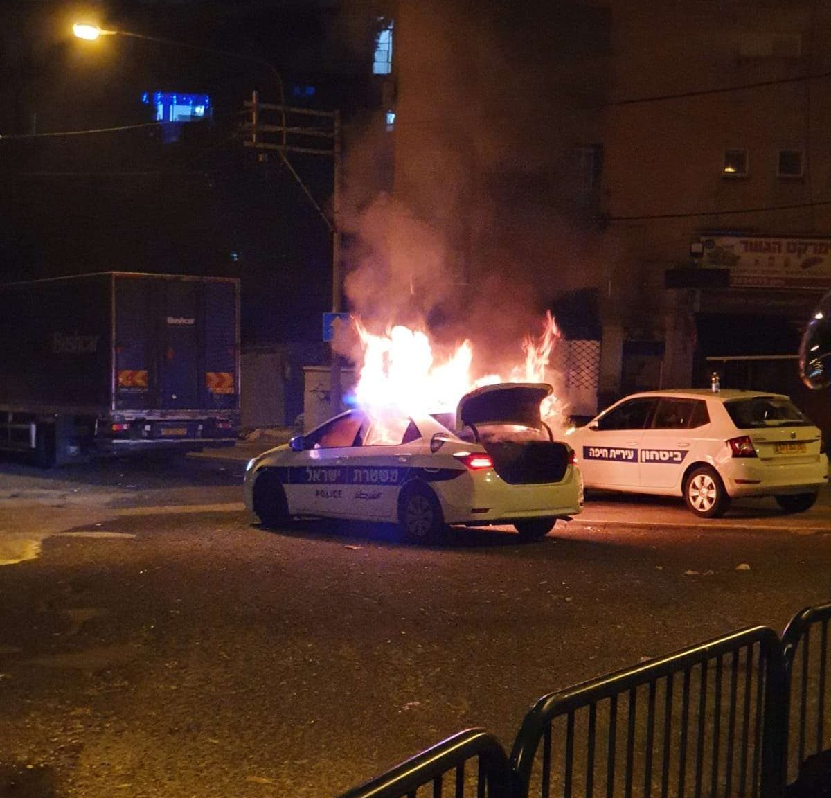 ניידת משטרה נשרפת במהומות בחיפה. השב"כ הצטרף להפסקת האלימות. צילום ארכיון דוברות המשטרה, מחוז חוף
