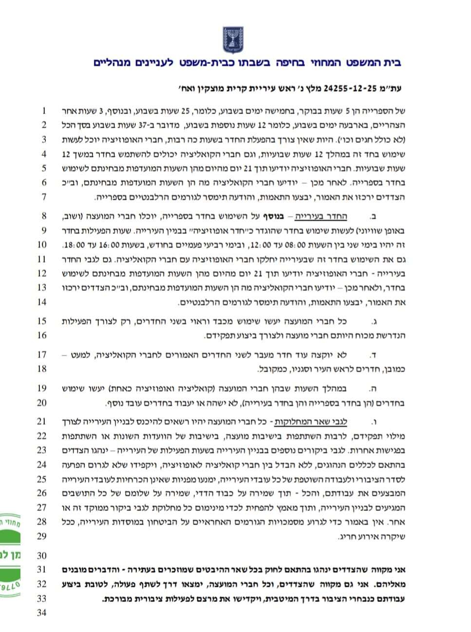 השופטת החליטה, כי יוקם חדר ישיבות בבניין הספרייה הסמוך, אשר ישמש את האופוזיציה והקואליציה שווה בשווה, בימים ובשעות קבועות. עוד קבעה השופטת, כי חברי האופוזיציה והקואליציה, ישתתפו שווה בשווה בחדר שיועד לכך גם בבניין העירייה. עוד נקבע, כי העירייה לא תקצה חדר נוסף לקואליציה, אלא על פי עיקרון השוויון כפי שנקבע על ידה. השופטת נאות פרי גם קבעה, שלא ימנע מחברי האופוזיציה מלהיכנס לבניין העיריה לצורך מילוי תפקידם, ובכך למעשה כל דרישות האופוזיציה התקבלו.
