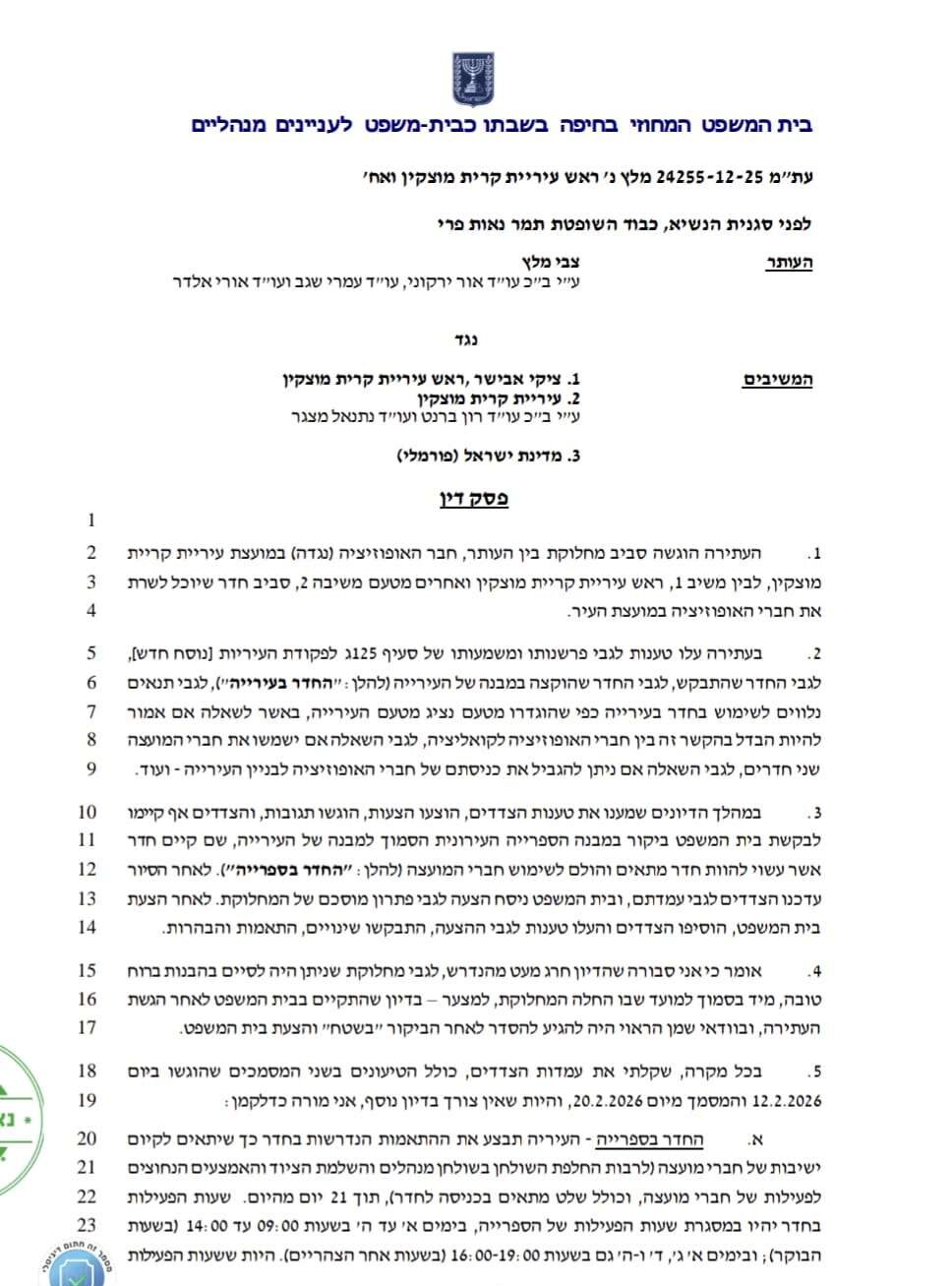 בית המשפט המחוזי בחיפה, בשבתו כבית משפט לעניינים מנהלים, הוציא תחת ידו פסק דין, המחייב את עיריית קריית מוצקין, לתת את אותם התנאים לאופוזיציה, כפי שמקבלים חברי הקואליציה. את העתירה הגיש יו”ר האופוזיציה צבי מלץ, נגד ראש העיר ציקי אבישר ונגד העירייה, אשר חויבו ע”י סגנית הנשיא, השופטת תמר נאות פרי, לשלם לעותר צבי מלץ, את הוצאות אגרת בית המשפט, תוך ביטול החלטת העירייה, שמנעה מאנשי האופוזיציה כניסה לבניין העירייה.